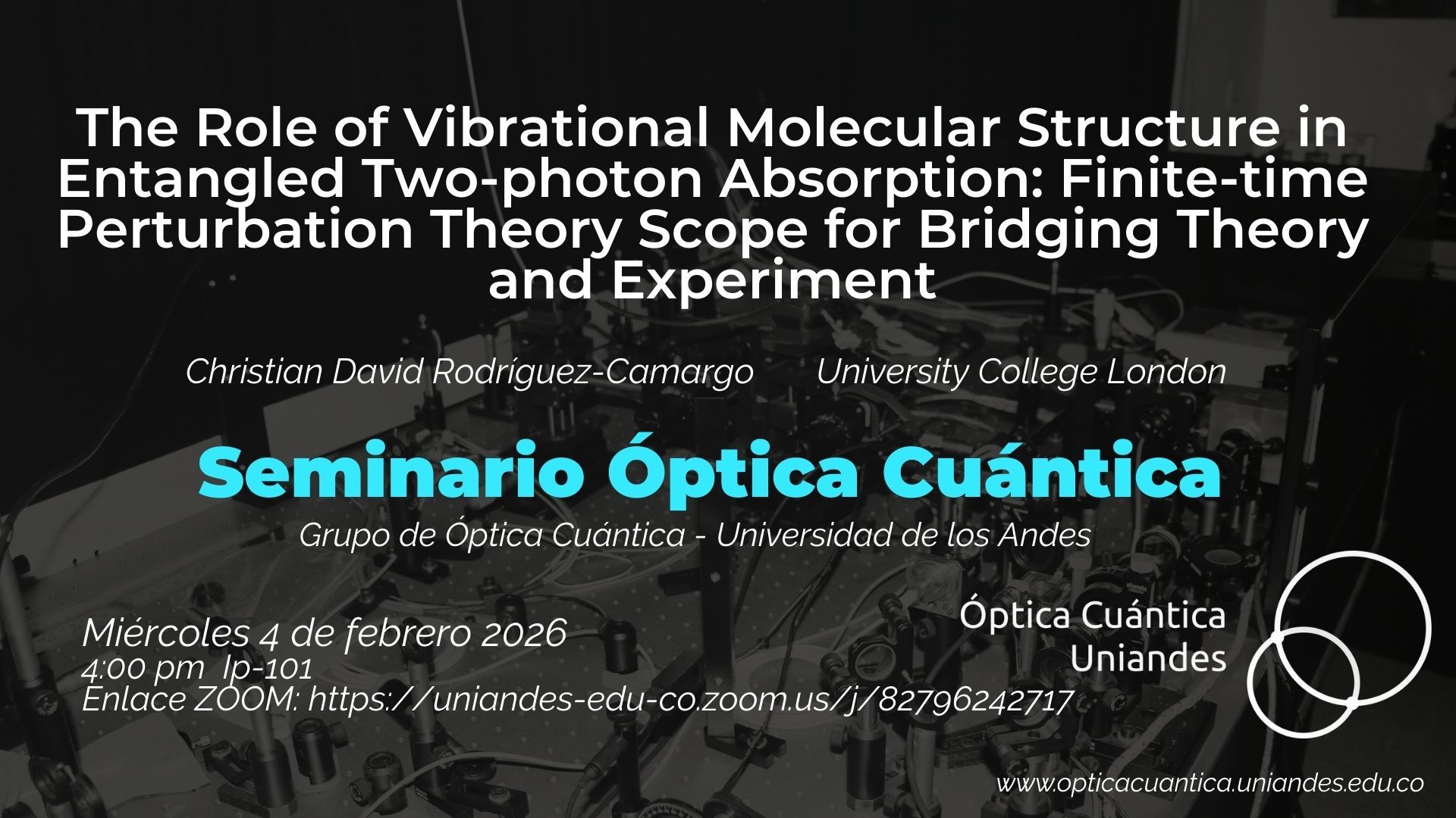 El grupo de óptica cuántica experimental de la Universidad de los Andes se centra en la generación, caracterización y manipulación de diversas fuentes de luz a nivel cuántico, con el objetivo de comprenderlas y aplicarlas prácticamente. En particular, investigamos la generación de estados de luz no clásicos y su uso en información cuántica. A través del proceso óptico no lineal de generación paramétrica espontánea, producimos en el laboratorio pares de fotones entrelazados y fotones individuales anunciados. Además, realizamos estudios experimentales sobre las propiedades de correlación temporal y espacial de diversas fuentes de luz, empleando técnicas interferométricas de varios fotones para distinguir entre estados entrelazados y separables, así como para evaluar la pureza de los fotones individuales.